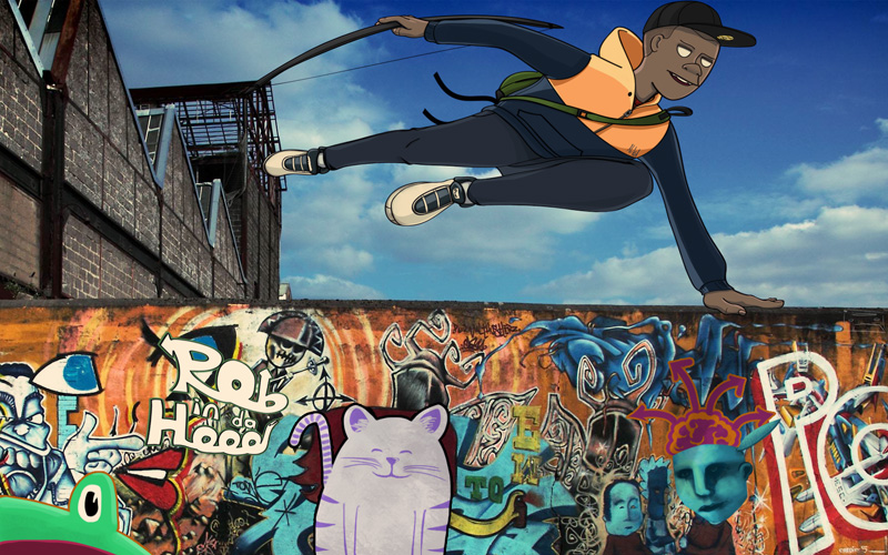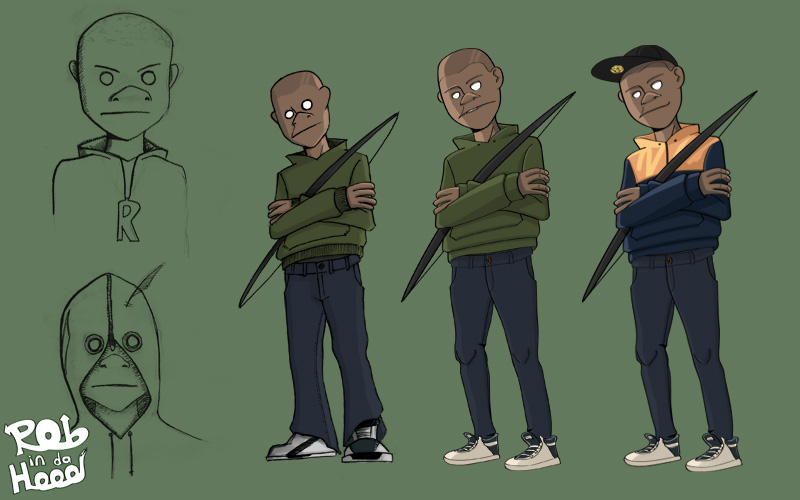 As part of my masters course we had guest clients setting briefs for us to complete, this was project was presented by Shelley Page of Dreamworks. The brief was to update a character to a modern day version from a list containing such characters as: Tarzan, Sherlock Holmes, Genghis Khan & George and the Dragon. I chose Robin Hood, the fictional English outlaw, and changed him into a dropped New York rapper, who steals jewellery (bling) and sells it to make money for a ghetto soup kitchen. The soup kitchen being run by the kind Father Tuck and frequented by the poor locals.